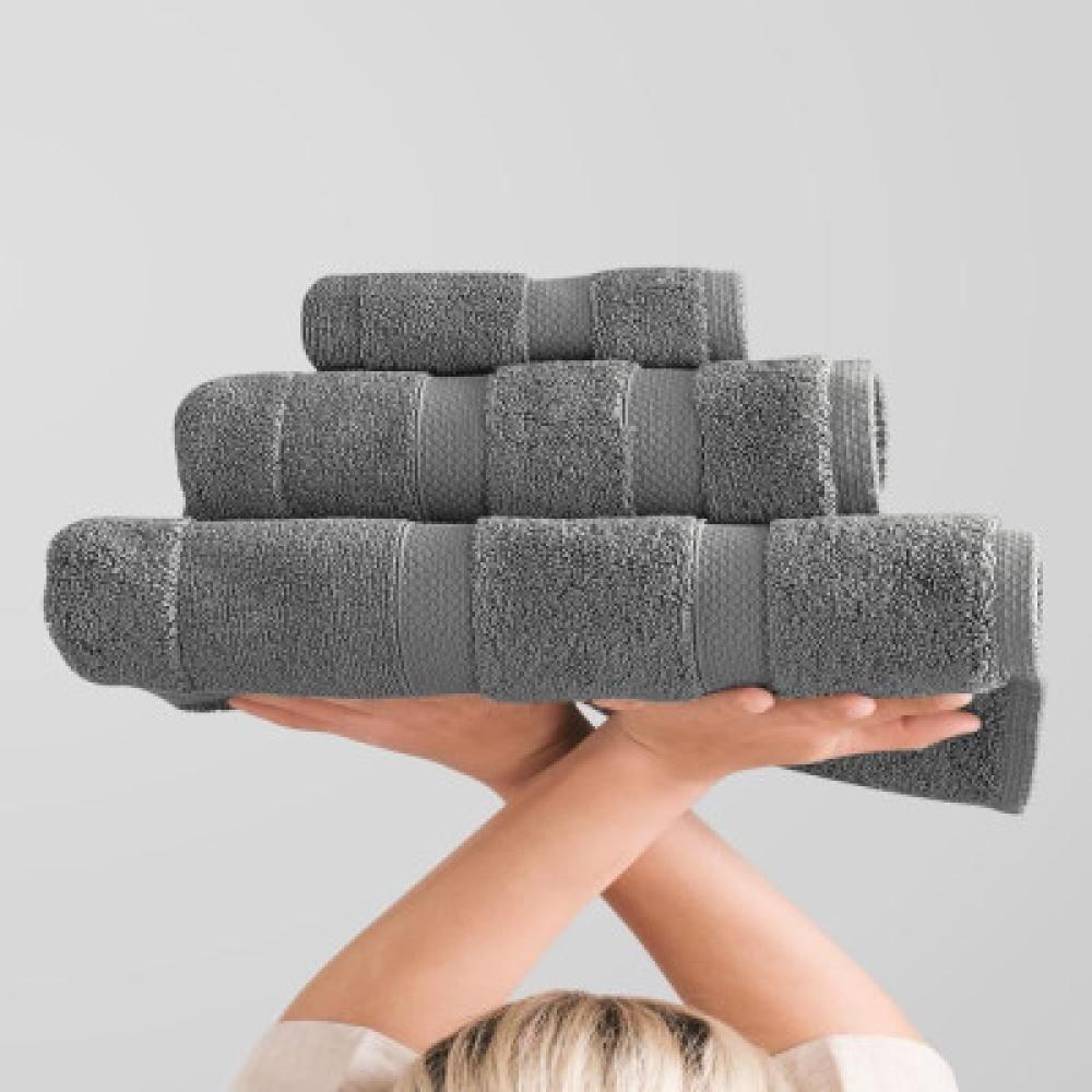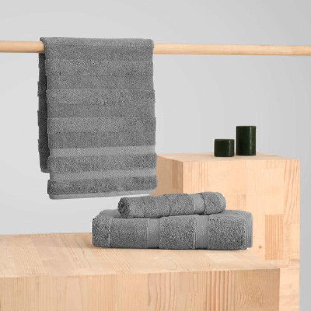 - مناشف باللون الرمادي قطن 100% منشفة وسط بمقاس 70X140 ومنشفة بمقاس 50X100 ومنشفة يد بمقاس 30 × 50